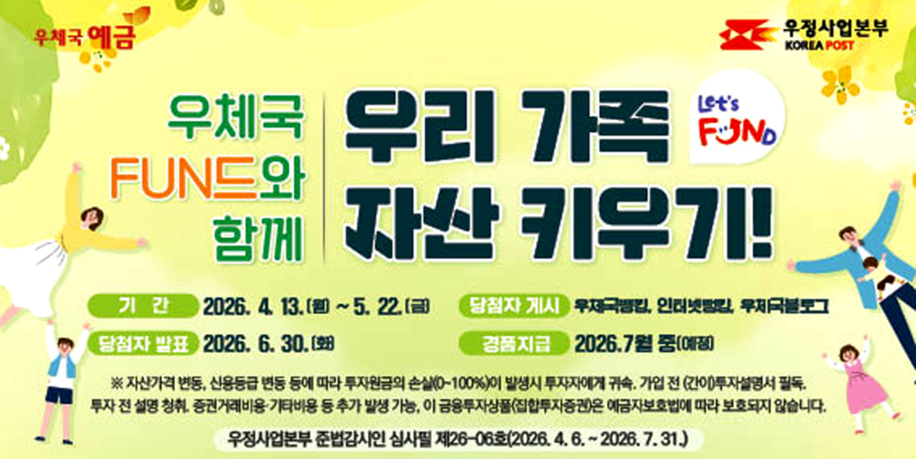 [SWTV 이정우 기자] 우정사업본부는 오는 5월22일까지 우체국 펀드 가입고객을 대상으로 ‘우체국 FUN드와 함께 우리 가족 자산 키우기!’ 이벤트를 진행한다고 13일 밝혔다.
