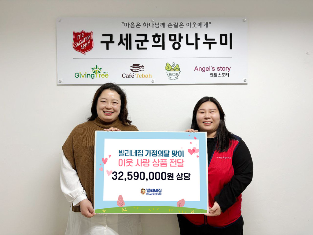 [SWTV 이지한 기자] 빌리네집은 가족의 달을 앞두고 지난 3월13일 구세군에 총 3259만원 상당의 물품을 기부했다고 22일 밝혔다.