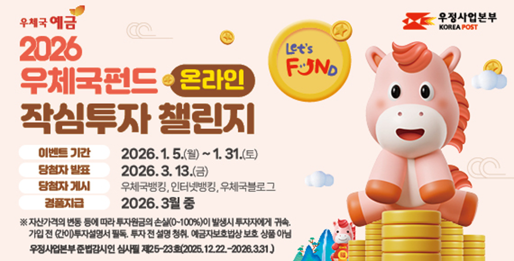 [SWTV 이정우 기자] 우정사업본부는 오는 31일까지 우체국 펀드 온라인 가입 고객을 대상으로 ‘2026 우체국펀드 온라인 작심투자 챌린지’ 이벤트를 진행한다고 5일 밝혔다.